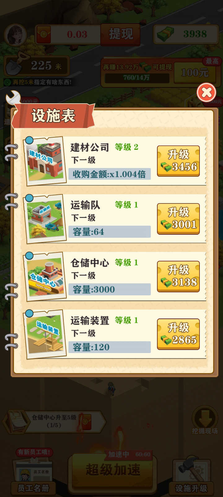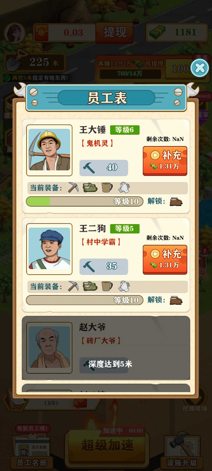 想尽快深挖最好的办法就是升级装备,消耗游戏币即可对装备进行升级,后面需要的游戏币比较多,必须看广告才能满足游戏进度。