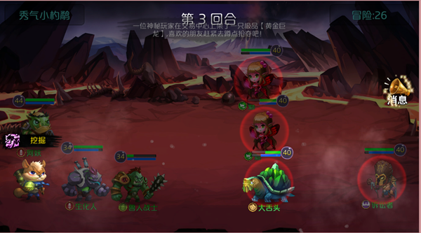 此时我刚好打到冒险36,居然过不了,一看这架势,哦~~我得换阵容了,我的3傻对着死乌龟在打,这个千年老肉龟龟壳可不是一般的厚,需要换阵容~