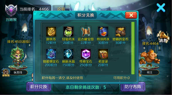 第3章刷到3星差不多1400名望了,还差4本名望录。当然我们可以耗费200点体力刷200次旧关卡,用几个祝福道具可以更快。也可以选择通关第四章冒险关卡,但是4生物上阵打第四章还是有点小难的。这时候我们不要忽略了积分兑换名望录: