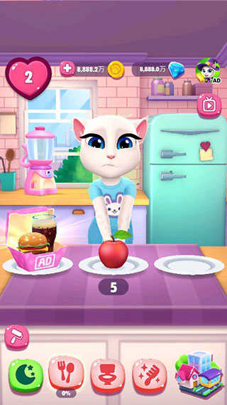 在安吉拉的厨房,我们需要注意不少事情。我们可以去点击后面的冰箱,购买食物,让安吉拉一口吞下。但并不是什么东西都是可以去吃的,餐桌上的饥饿药水,如果我们让安吉拉喝下后,就会导致她的饱腹感变为0,我们让安吉拉吃下去的食物也会毫无作用。安吉拉后面的榨汁机如果频繁使用,会发生巨大的爆炸。而且会溅到页面上来,我们就需要多次点击污渍,才可以去除哦!