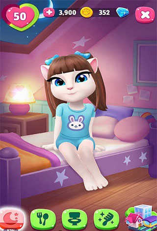 当我们进入游戏后,安吉拉就会蹦蹦跳跳地出现在我们面前,热情的和我们打招呼。在休息娱乐篇中,我们主要有几件事可以去做。当安吉拉需要睡眠时,也就是图标变成黄色或者红色的时候,我们就可以去点击安吉拉的小床,然后点击床头灯,安吉拉就会进入到睡眠状态了。