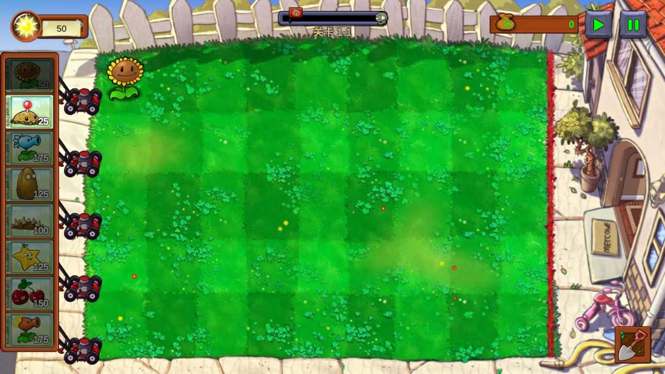 选择好之后可以开始安放植物了,在这里建议多放一些向日葵,不过在植物大战僵尸重生当中一个阳光的数值是50!这也减少游戏的难度!