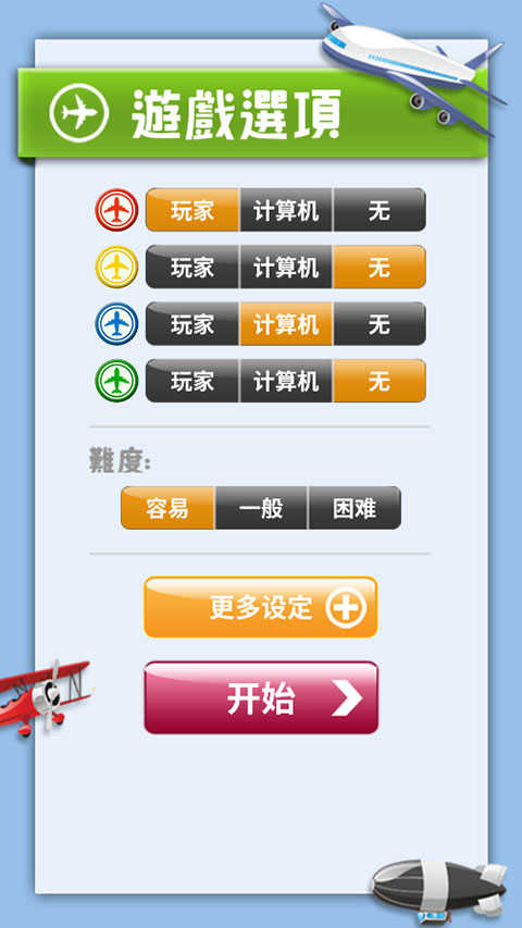 这时有个“游戏选项”,可以选择每个颜色的飞行棋是玩家还是计算机,还能设置难度和起飞号码;
