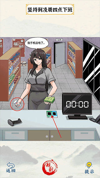 7、电话铃声:点击电话,拖动货架上的商品,找到螺丝刀,并将螺丝刀拖动到显示器上将时间调整为四点,然后点击门通关。