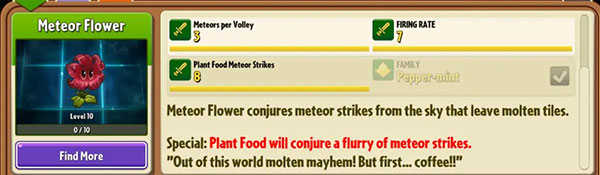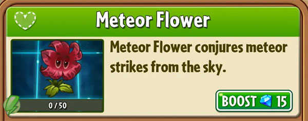攻击范围为全图,攻击方式是对有僵尸的格子召唤从天而降的流星(1级植物普通攻击每次陆续砸出2颗流星,6级开始变成每次陆续砸三颗,meteor flower可以同时锁定多个僵尸进行攻击,不会只对着一个僵尸砸流星),砸在格子上会造成一格多一点的范围伤害,并在该格子留下持续一段时间样式为“覆盖有岩浆的龟裂熔岩地砖”的特殊地砖,站在特殊地砖上的僵尸会受到持续伤害,过一段时间熔岩地砖上岩浆会消失,而后暴露出底下的龟裂的熔岩地砖,再过一段时间熔岩地砖消失变回原本的普通地砖,在变回普通地砖之前,无法将植物种在特殊地砖上面,如果砸的地砖上面有墓碑这种障碍物,无法生成特殊地砖(未进行全种类的障碍物测试),同样meteor flower会对墓碑进行索敌,可以对墓碑造成伤害。下面几张gif便可直观感受meteor flower的攻击过程。