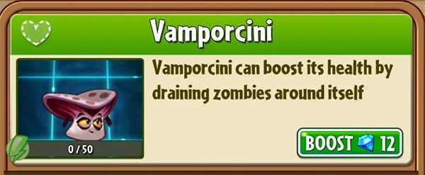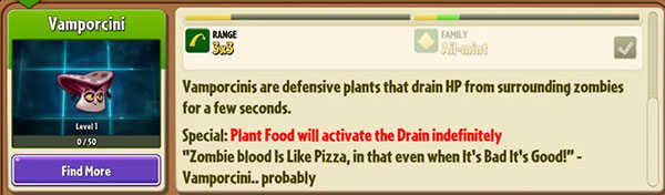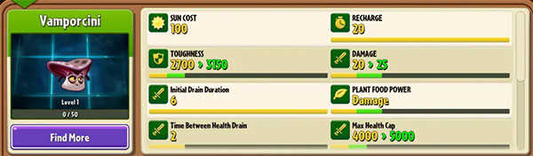 一句话总评:植物家族为Ali-mint家族(毒系),阳光消耗固定100,定位算是防御型植物,刚种下对周围范围吸血,开大获得永续吸血效果,伤害非常刮痧,1级坚果墙血量是4000,而他只有2700,那个不知道是不是bug导致的刚种下时的吸血状态还不会阻挡僵尸,实用性不强,画质不如你油最强盾向日葵
