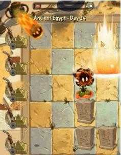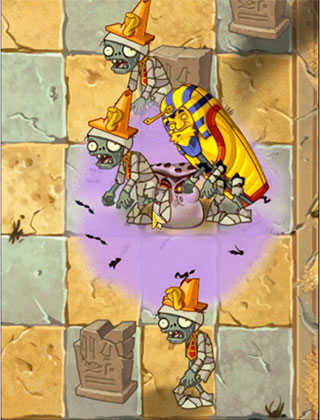 然后这个植物的缺点也就很明显了。从上面图2、图3可以看出,此植物非常容易伤害溢出,可能多个植物同时锁定同一个目标,然后导致目标已被清除依然对原来目标的位置继续砸流星。并且,多个meteor flower同时索敌时,会出现大量的meteor flower的攻击被“吞掉”的现象,仔细观察图3的法老王僵尸挨完攻击后只是残血可以判断,并不是因为贴图位置重合,而是上面9棵meteor flower同时攻击真的一共就只砸出了4颗流星……所以在布阵关中,不要预先把所有的meteor flower同时预先种上去,要分开种植错开他们的攻击间距。并且,在实战中,可能出现被套路的情况,meteor flower发动攻击的时候,目标即将离开所站的格子,但锁定的还是那一格,等流星落下造成伤害的时候,目标已经离开了流星砸下来的造成伤害的范围。并且,实战中发现,meteor flower在刚被种下的时候,会出现“发呆”现象,不会立即发动攻击。