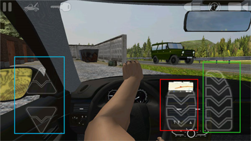 左上角点击钥匙按钮启动车辆,蓝色是换挡,红色为刹车,绿色为油门,倾侧手机可以控制车辆方向,默认为第一人称,还可以点击右上角切换为第三人称。
