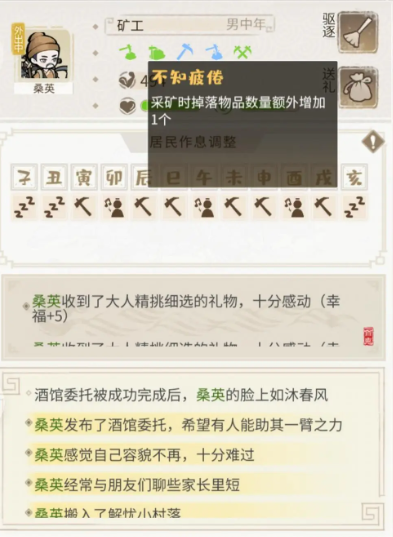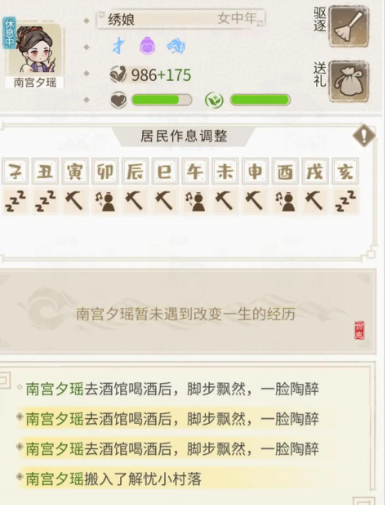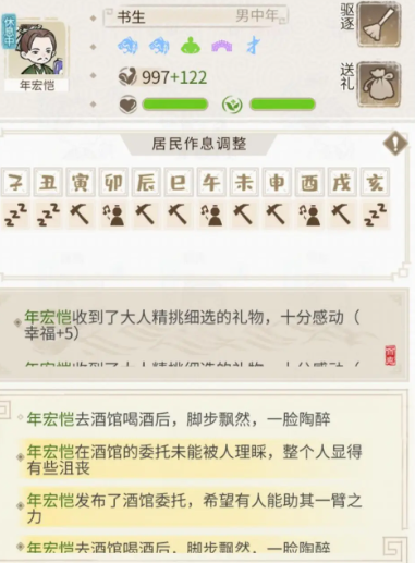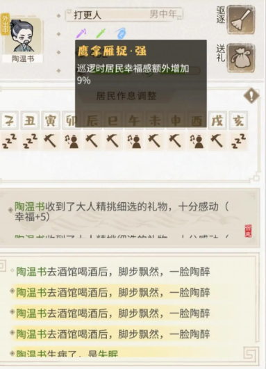 他通常都在休息状态,点击他会显示两个选项,分别代表两种功能。其中一个是在满足升职条件时派他进京,等待一段时间后回来通知你升职成功,具体时间忘记了;另一个是让他外出探索,每次探索需要15分钟,可以使用道具,但道具似乎不会减少探索时间。完成探索后,他会带回一名随机能力和职业的村民,或者直接给你5000铜钱。