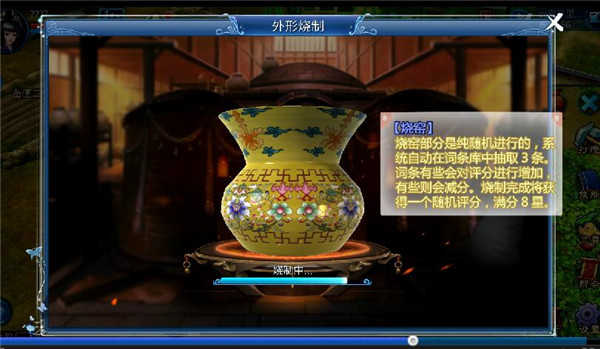 再者,要有气!此“气”特指运气,在完成了塑形与上釉之后,要将传家宝送入窑中烧制,在这期间会出现很多种状况影响烧制的完美度,最终则反映在传家宝的星级评定上,如果少侠运气够好,很可能会烧制出最高8星等级的传世之作哦!