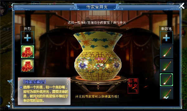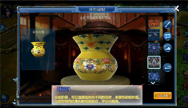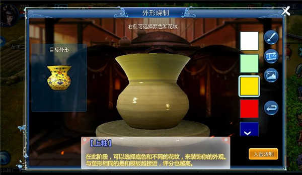 其次,要色!色即釉色。所谓“梅虽逊雪三分白,雪却输梅一段香”。在中国文化传承中,瓷器的颜色多姿多彩,不一样釉色有着不一样的美,在游戏中,少侠选取不同颜色的釉色包裹塑形好的传家宝,每一种颜色都有一种古韵在其中。
