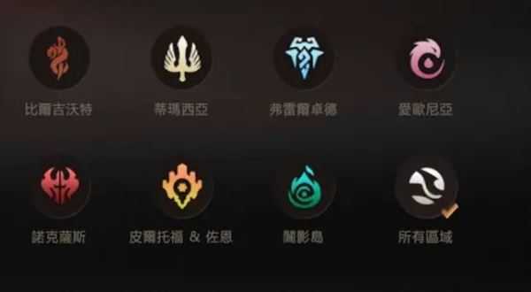 1、地区:比尔吉沃特,德玛西亚,弗雷尔卓德,艾欧尼亚,诺克萨斯,皮城和祖安,暗影岛