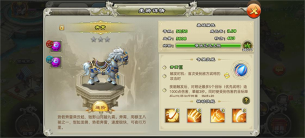 龙文:进攻型战马,干扰能力强,克制比较依靠技能输出的武将,用法同麟驹。