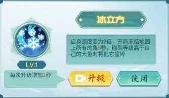 自身速度变为2倍,开局冻结地图上所有的鱼5秒,碰到等级高干自己的大鱼时将把它撞碎