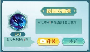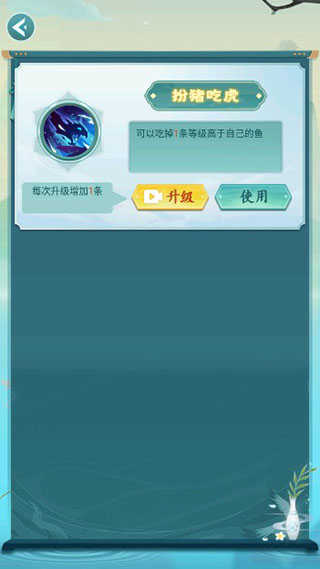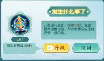 开局进行变身,持续30秒。变身期间速度加倍,所有鱼都变成比自己低一级的鱼。