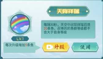 每隔30秒,天空中出现祥瑞召唤20条鱼,召唤的的鱼群等级都不会大于自身等级