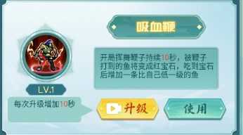 开局挥舞鞭子持续10秒,被鞭子打到的鱼将变成红宝石,吃到宝石后增加一条比自己低一级的鱼