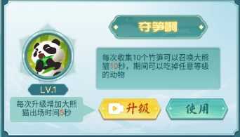 每次收集10个竹笋可以召唤大熊猫1秒,期间可以吃掉任意等级动物