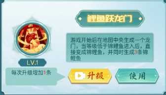 游戏开始后在地图中央生成一个龙门,当等级低于锦鲤鱼进入后,直接变成锦鲤鱼,并同时生成3条锦鲤鱼