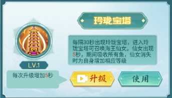 每隔30秒出现玲珑宝塔,进入玲珑宝塔可召唤仙女。仙女出现期间吸收所有鱼,仙女消失时为自身增加相应等级