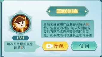 开始时以雪糕刺客的身份出现,速度提升至两倍,能够从侧面或后方刺杀等级高于自己的鱼,成功刺杀后可以成长到相同等级。