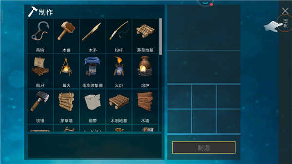 虽然垃圾比较多,但前期的难度还是一直有的。鲨鱼偶尔也会咬你的小船。你只要造把锤子,有素材就可建造,扩大你的小船。建造的复杂程度没啥难度,主要就是素材的收集。制作食物也很简单。