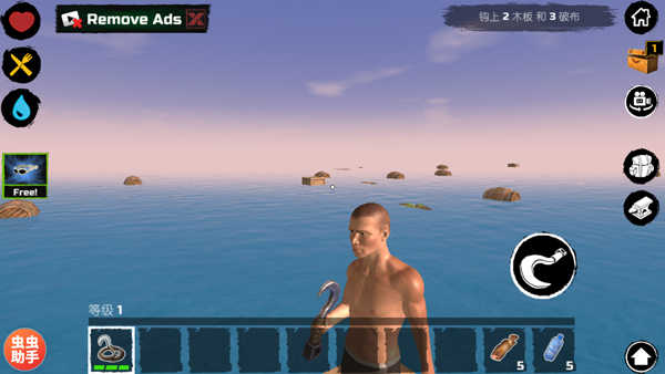 木筏求生游戏开始就坐在一个4X4的小木筏上,然后靠着打捞周围垃圾过日子。垃圾是物资的一部分来源,游戏本生就是以海上过着漂流的生活。最大的敌人是一条鲨鱼,它基本每时每刻都围绕着你,偶尔远走下。