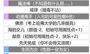 如果你和我一样是自选十个天赋开局,再推荐同时勾选【魔法棒】、【动漫高手】、【生而为女】,概率触发魔法少女路线,成为魔法少女+80体质,杀死其他魔法少女+88体质,而且不必担心会出现500岁的修仙魔法少女,因为到了20岁强行回归普通人……所以可以和修仙路线并存,因为修仙体质很容易不够,而且凡人100岁之前不算游戏开始,强烈推荐成为魔法少女白嫖体质