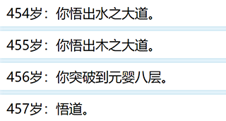 悟道这个地方非常阴间,是游戏最最看脸的地方,因为第400年开始你才有可能成功悟出道,10个道里面你每年有1%机会悟出来,悟出来以后就不会触发,在这短短100年内,你悟全10个道的概率大概是0.8%。