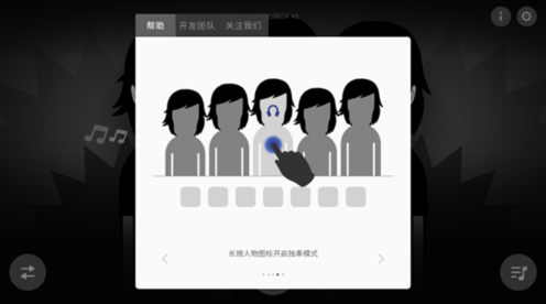 点击人物图标开启禁音,长按人物图标开启独奏模式,向下拖动人物图标则停止音乐