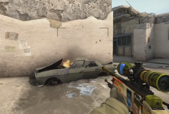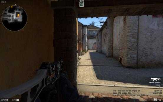 当T进攻B点断后的时候,站这里比贴墙好的原因是因为地图的改动,香蕉道门口两边都可以站人,此时如果对手稍有头脑就会先看右边(图中准星瞄准的地方)再来检查左边,此时你完全可以提前半个身位知道他的动向。