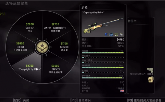 PAWP,价格4750,CSGO武器中威力最大的枪械,打中四肢以外的躯体1枪必死。