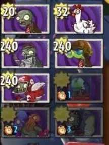 同样,游戏也向对战双方开放了8款可供上场的僵尸,可使用的僵尸固定,分别为普通僵尸、僵尸鸡、读报僵尸、机枪豌豆僵尸、全明星僵尸、护盾僵尸、章鱼僵尸和大汉铜人僵尸。与植物卡槽一致,僵尸卡槽的解锁顺序也受回合影响,随着回合数目的推进,将会逐步解锁更强的僵尸槽,僵尸卡片的左下角将会提示该槽位解锁还需的回合数目。