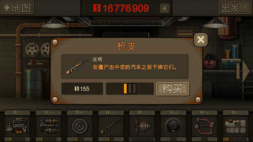 游戏的细节做的很棒,在升级界面中,当你升级引擎或变速箱时,在战车的前端会有略微的下沉,在战车行进的过程中,重量分配不均就会容易后翻或前倾影响车速,这个时候就需要在车库里购买升级重新配重,这对战车的稳定性十分重要。在升级轮胎的前后对比中,上坡时的爬力会明显的体现出来。小编认为武器配置设计的不是很好,武器是自动发射的,一枪一个,打完就废了,而且只能够对僵尸进行射击,如果把它改为玩家手动触发能够升级为更强大的火炮就更爽了,而且对障碍物和建筑物业能够进行攻击的话,那画面感就更是上了另一个境界了。
