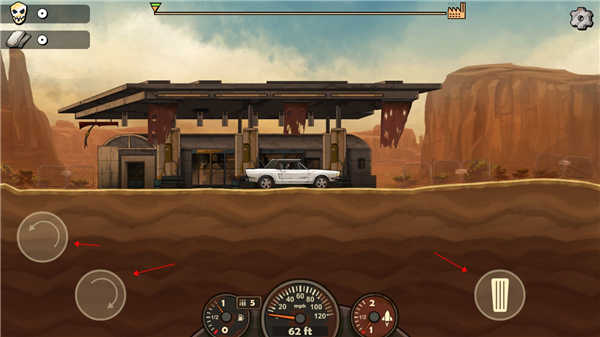 这个游戏也是一个闯关类玩法,一关可以说是非常的长,所以在游戏当中每一关都给我们安排了三个记录点,也算是游戏比较良心的一个地方了,所以如果你不想从头开始的话就要抓紧时间到达下一个记录点,当我们完成这三个记录点之后就可以开启下一关了。游戏的操作也可以说是非常的简单,左边是翘起车头和翘起车尾,中间是一个仪表盘和油量,我们要时刻注意到这个油量才能让我们跑得更加远,右边是一个加速相当于油门,基本上我们要时刻都按住,不然在规定的时间内没有到达的话这把游戏就结束。