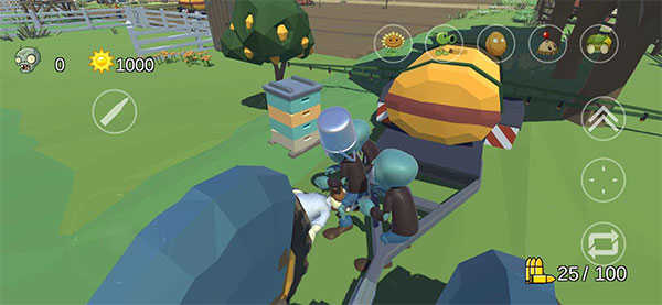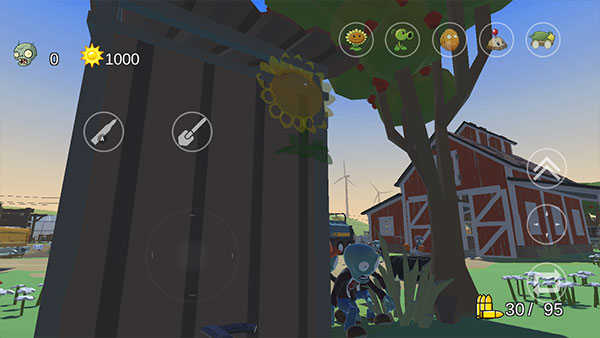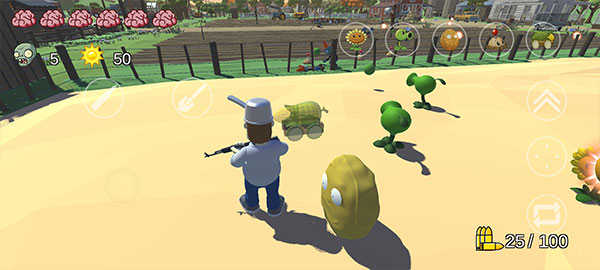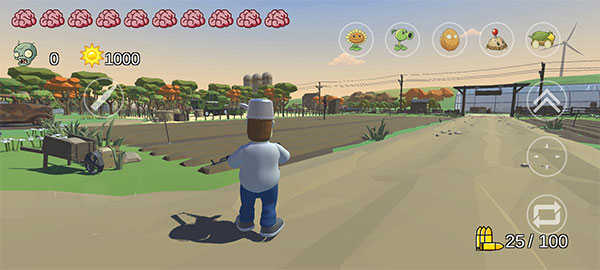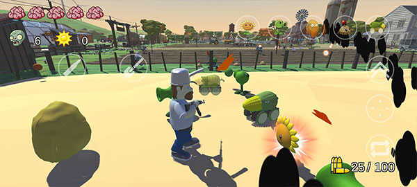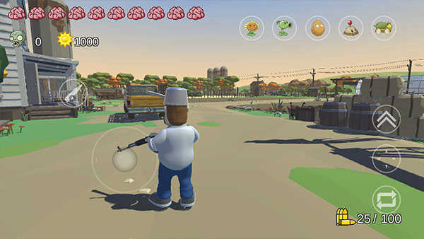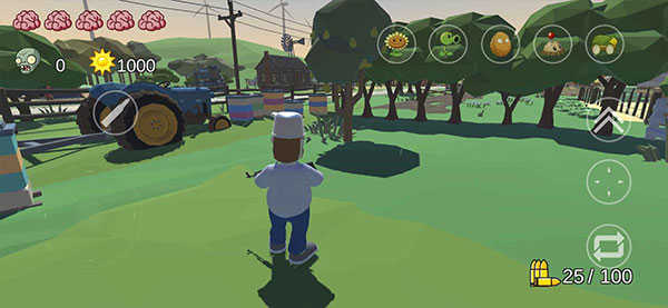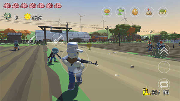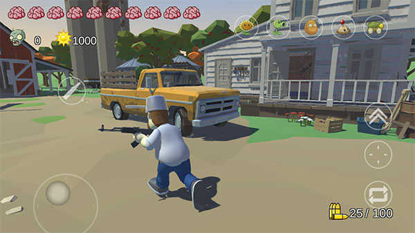 左上角的“大脑”是生命值,底部是目前已击杀的僵尸数量和阳光数,滑动右侧屏幕可以旋转视角,还有跳跃、瞄准以及换弹等快捷按钮。