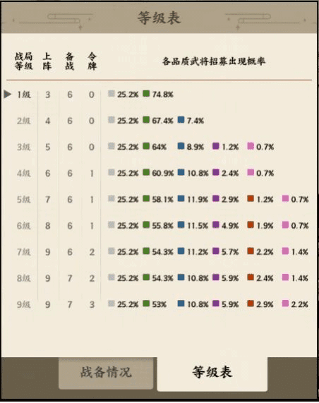 战局等级:使用军饷可以升级战局等级,不同的战局等级可以提升不同品质武将在招募列表的刷新几率。下图的等级表中可以查看各品质武将的出现概率,其中白色代表杂兵,绿色代表良将,蓝色代表名将,紫色代表稀世,橙色代表绝品,粉色代表美人。未达到对应品质武将出现战局等级要求的,不会在招募列表中刷新到对应品质的武将。