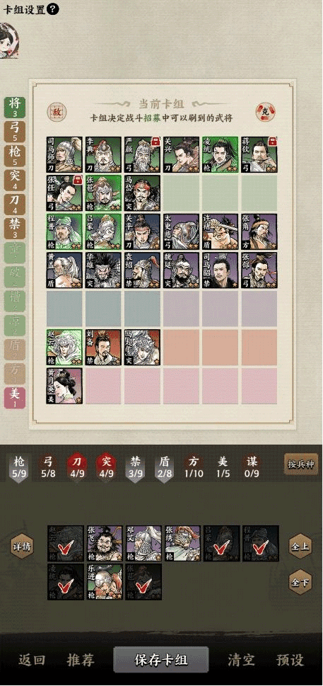 注意,每个品质的武将有最低数量限制。游戏初期系统会根据您招募到的武将自动填充卡组列表。