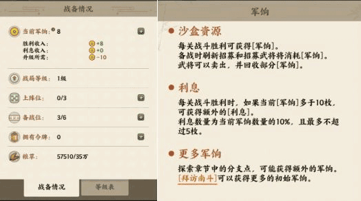 沙盒资源:在主线关卡中,初始的沙盒资源为“军饷”,武将的招募与招募列表的刷新和战局的升级都会消耗“军饷”。主公可以通过战斗胜利获得军饷,也可以通过探索当前章节内的随机事件获得额外的军饷,开通南斗特权卡后会增加额外的初始军饷数量。