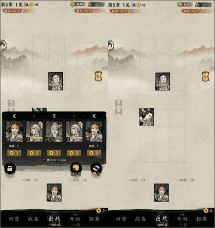 备战状态:招募与上阵。进入主线关卡后,点击界面中的【继续】按钮即可开始进行关卡战斗。点击【继续】按钮后,即进入备战状态。备战状态会首先弹出招募窗(如下图一),主公需要根据自身所有拥有的军饷(沙盒资源)数量来招募对应的武将。