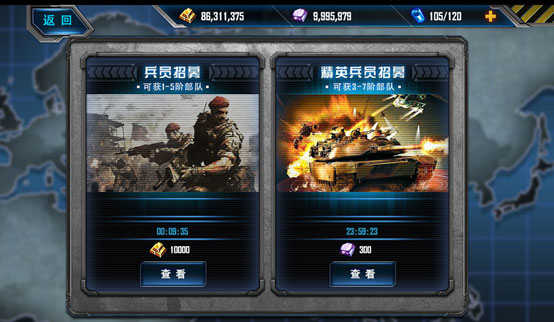 兵员招募花费金条,可获得1-3阶部队;精英兵员招募花费钻石,可获得5-7阶部队。