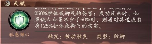 苏莱悦作为被动防御型侠客,每当她受到敌方普通攻击时,她将有50%的几率对敌人进行【反击】,造成自身250%护体或御气的伤害;当成功反击时,敌方血量大于50%,将会对其再次造成125%的护体或御气伤害。可别小看这样一位看起来柔弱的西域女侠,她的狐惑倾心在战场中绝对不容小觑。