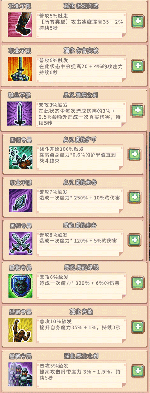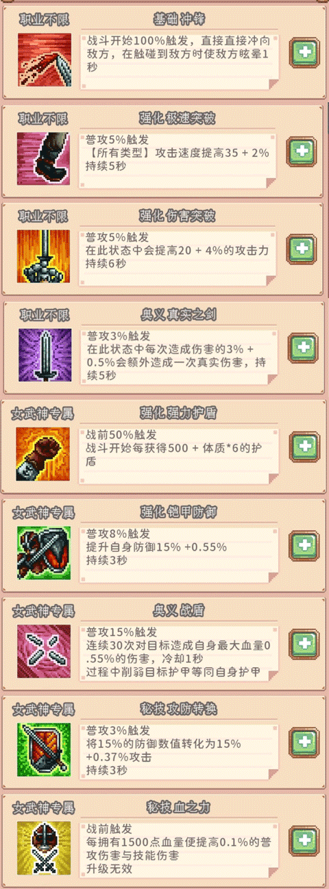 女武神:近战职业,版本弃子,特色反伤,伤害依靠堆叠防御然后转换成攻击力,基本算是勇者二号,不建议轻易尝试,十分折磨。