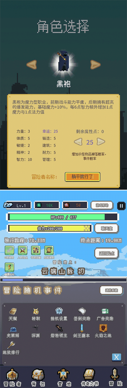 这里有很多冒险的玩法。每一场战斗都能提高你的战斗力。来为你的英雄配置更多不同的属性吧。