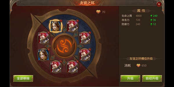 友谊之环对玩家属性起一定作用,玩家属性的强大友谊之环也是不可缺少的一部分。友谊之环槽位通过消耗友谊印记进行槽位升级,槽位中可佩戴普通好友和好友关系组的特殊好友,普通好友属性加成为105%,好友关系的好友属性加成为120%。