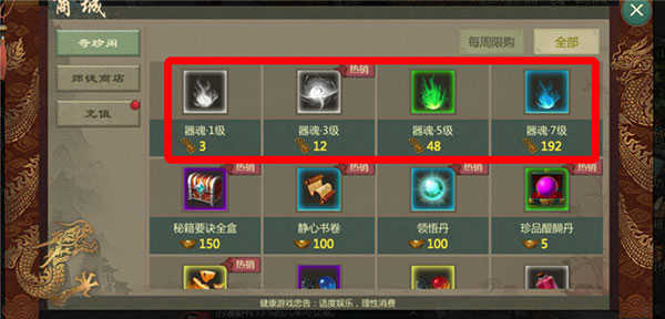 装备器魂:在商店使用银票购买,镶嵌在装备上,增加角色潜能点。