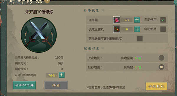 在商城买【修炼丹】,增加30分钟10倍经验的野外修炼时间,每天只能吃1个。如果不想每天都挂机,每天吃1个【修炼丹】,把修炼时间积累起来,然后集中一次性挂机消耗掉。