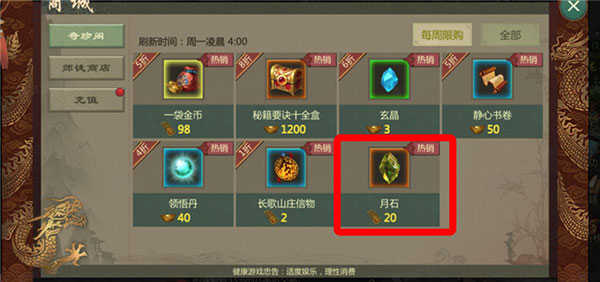 装备雕刻:使用月石或者玄铁进行雕刻。玄铁通过部分活动或者在商店使用金币购买;月石需要在商店使用银票购买(每周限购500个)。