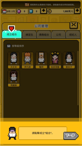 (1)玩家创建好属于自己的公司之后,就可以挑选自己喜欢的练习生打造偶像团体了,在上方的任务按钮进入挑选界面。
