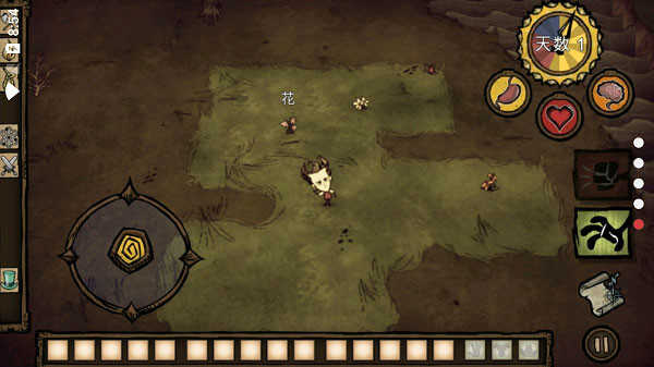 进入游戏后,第一件事是搜集附近的浆果、萝卜和燧石,这三项在道具栏最少要保持3个的数量,浆果萝卜可以吸引兔子或自己食用,燧石则是初期有限的资 源,伐木采矿的工具都需要先做出来,再来将树枝、草、木材之类的工具营火必须道具收集满一组,就可以准备大范围探索了。刚开始的夜晚都很短,木头营火勉强 可以烧整晚,记住要等完全入夜之后再生火,以免浪费资源。火炬也是入夜探索的利器,持着火炬绕着地图边缘走,听到蜘蛛或其他生物叫声不用停下,持续逃跑, 蜘蛛最远追到天亮也会停下,到时候又是一只就地睡着代宰的蜘蛛等着你。打到的怪物肉都留着,招募二师兄可以用,不要自己烤来吃,会减血的。
